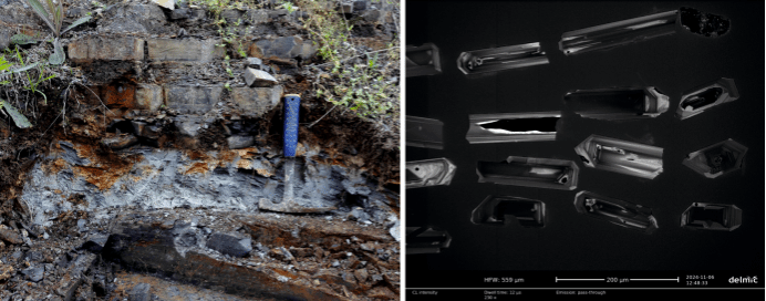 图1. 贵州谷脚剖面大冶组底部的一层火山灰(左),火山灰中的锆石阴极发光照片(右)