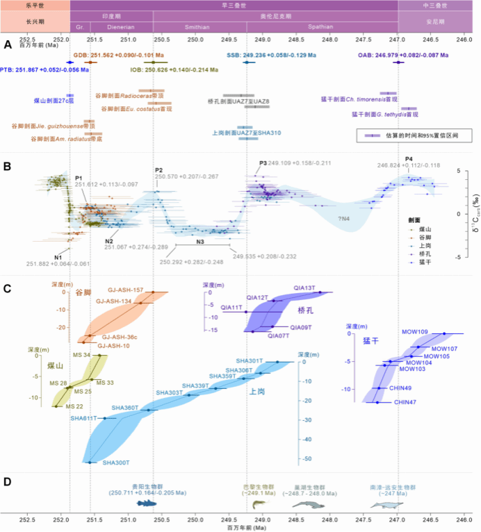 图2. 基于火山灰高精度锆石喷发年龄和年龄深度模型(C)更新的早三叠世年代地层框架(A)和碳同位素曲线(B),以及四个早三叠世海相生物群年龄估算(D)。